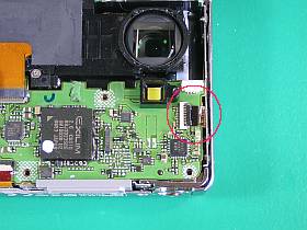 主基板を外す際、右端のフレキ・コネクタはあまり見掛けないタイプで、留め方も要注意!(左/上写真、赤丸印。これは、戻すのも苦労しました!ホント、この留め方でいいのかなぁ?)