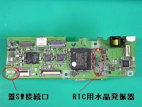 そしたら、RTC(リアル・タイム・クロック)の発振(32.768KHz)が現れました。(左写真<クリック>で、発振波形:主基板表の細長いパッケージ「EAG1」が発振器)