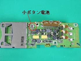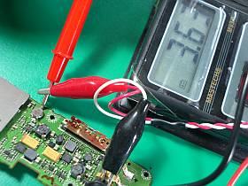 中央上やや左側の小さなボタン電池の両端電位差が、0.13Vとかなり低かったので、試しに3.6V程を直接加えて、充電してみました。(左写真)