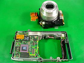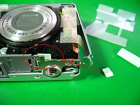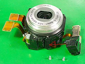 分解して色々やってみた挙句、最後に、レンズ駆動モータ/ギア箱部を押し付けるように細工したら、何とか直ったようで、撮影・終了動作も正常になりました。(左上写真<クリック>。しかし、何時まで保つやら)