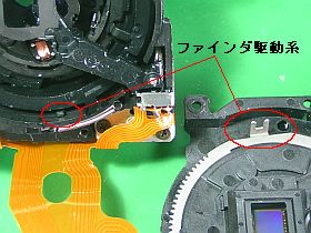 CCDマウント部にへばり付いているギアは、始め何用なのか分からなかったのですが、どうやらこれは、光学ファインダのズーム調整駆動用のようです。