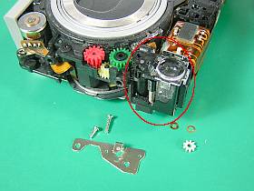 異音の原因は、光学ファインダ部のズーム・メカのギヤ部で、これの芯棒が半抜け状態で、カムを無理矢理こじていたせい。