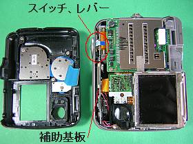 左写真は、(上部)補助基板を外した状態ですが、その際フレキ2種(前小と後大)と小コネクタ1種(電源スイッチ用)を外しました。
