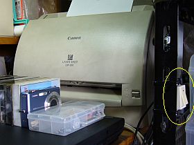 問題のプリンタLBP-250は、狭い空間に押し込んであるのですが、本体の電源SWが後部にあって操作が不便なので、ACオン・オフSWは、前に引き出してあります。(左写真の黄印)