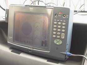 しかし、以前に助手席に置いて走ってみた時にはあまり気にならなかった画面の反射が、コンソールにまで上げるとやたら目立つ。それにも増して、液晶がDSTNタイプなので斜め方向から見るとコントラストが落ちてしまって、甚だ見難い。画面の大きさが魅力だったのだが、実際にやってみると期待ハズレ。