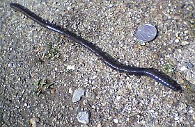 田舎道(?)を歩いていたら、"おわっ!"...危うく踏んづけそうになった。陽気に誘われて、土の中から這い出して来たのだろう。しかし、大きい!それに、黒い!!普通の赤茶色のやつなら、以前もう少し小さいのは見たことがあるが、こいつは何を食ってこんなに大きくて黒くなってんだろう?(もち、土なんだろうけど)