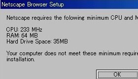 多分、メモリは、ネスケの使う分を差っ引いた残りが64MB以上でないと駄目なんだろう。(贅沢なブラウザだぞなもし!)