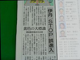 9/11の朝刊をチラッと見たら、“伊丹「STOP」誤進入”(左写真)とあったから、きっと新しい“誤進入防止策”なのかなと思って見直すと、タキシィング・コースに“STOP”と大書するらしい。(左写真<クリック>)