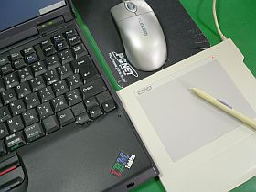 ぺン&タブレットかマウスのどちらかだけの使用を考えていたが、ペンの方はホイールが無いので不便だし、マウスも微妙な位置決めが難しいので、両方使えるようにした。(机狭っ!)