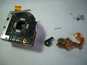 CCDを外すと、手振れ防止用の振動部マグネットはまだちゃんと台座にくっ付いているのが見て取れました。が、補助レンズのひとつが中で踊っていました。(左写真)