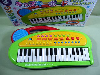 最初、百五円で買った玩具のキーボード/ピアノモドキ?から始まって、最後には(一応)本格的な玩具キーボード(西松屋キッズキーボード \1,299税込み 左写真&<クリック>)を買いに走るまでにエスカレートしました。