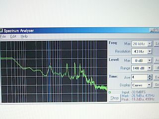 それの「音」が、百五円のとどう違うのか気になったので、ノートPCに通信用マイクを付けて、アナライザ・ソフトで調べてみました。(左写真)