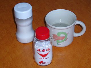 来た当時、孫娘一家は全員風邪を引いていて、“コンコン、ゴホンゴホンの大合唱”でしたが、こちらは、“うつされてなるものか!”(笑)と、せっせと「食卓塩」で嗽(うがい)!(左写真)