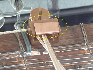 そこで、薄銅板を切って「当て金」にし、紐もナイロン紐に替えました。(左写真)