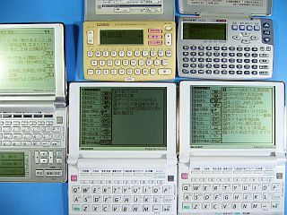凝り性なもんで、孫息子に買ったついでに、自分でも確かめるつもりで、少し気合を入れてオークションで入札しまくったら、電子辞書実働品が5台にもなってしまいました。(左写真)