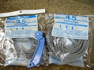 網を剥がす前には、あまり気に留めて居なかったのですが、実は「網押さえゴム」のサイズが、以前は3.5mmΦだったのに、今回は太い目の4.5mmΦ(7m,\208税込み)を買ったのです。(左写真)