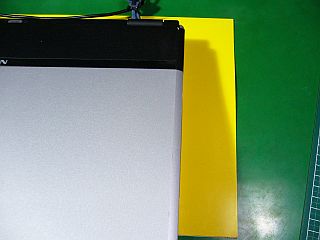 この導電性マットは、サイズが中途半端だから結構安かった(90x34cm2 総費用\1,210送料,手数料込み)から買ったのですが、よく考えると、幅34cmだと後1.5cmほど不足でして、段差発生は避けられない状態でした。