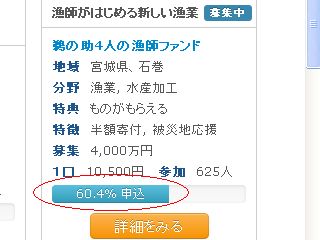 私の応援している、地震津波被災地−宮城県石巻の復興応援ファンド(半額寄付、半額投資)のひとつ、「鵜の助4人の漁師ファンド」(左図<クリック>)の応募額が、やっと60%を越えた!(左図)