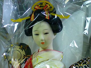 代わりに、綺麗な“日本人形”で、コンパクト(高さ約30cm)で廉価(一千円台〜二千円台)なのを見掛けた...見ると、「外国おみやげ品」だそうな。