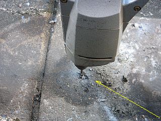 太目の金槌で、タガネと(センター・)ポンチを叩き込んで、コンクリートを少し破砕した後、「コンクリート用ドリル刃(6.0mm径)」で孔を開けて行くことを、幾度も繰り返してみた。(図4<クリック>)