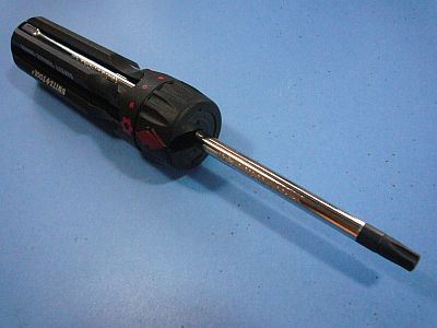 このドライバ・セットは、サイズが異なる6本のドライバ芯が、“胴回りの溝”に納められていて、上部の回転部を廻して1本の芯を取り出すのだが、それを“胴の中央部”までスライドさせるだけ。
