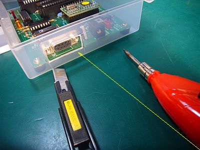The "flash writer" needed to open a square window (of polyethylene ) for the RS232C connector, so I roughly cut it with a "5W soldering iron" with a thin tip, and then "cutter". It was shaped with a "knife". (Fig.1)