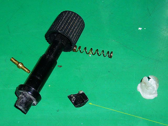 「回転式スイッチ」部を分解したら、「小真鍮棒」を回転させる為のレバーの片側が折れていた。(図3)