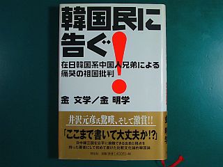 『韓国民に告ぐ! 在日韓国系中国人兄弟による痛哭の祖国批判 金 文学、金 明学共著 蜂須賀 光彦訳 祥伝社 平成11年12月 1刷 \1,300+税』 (購入\200税込み)