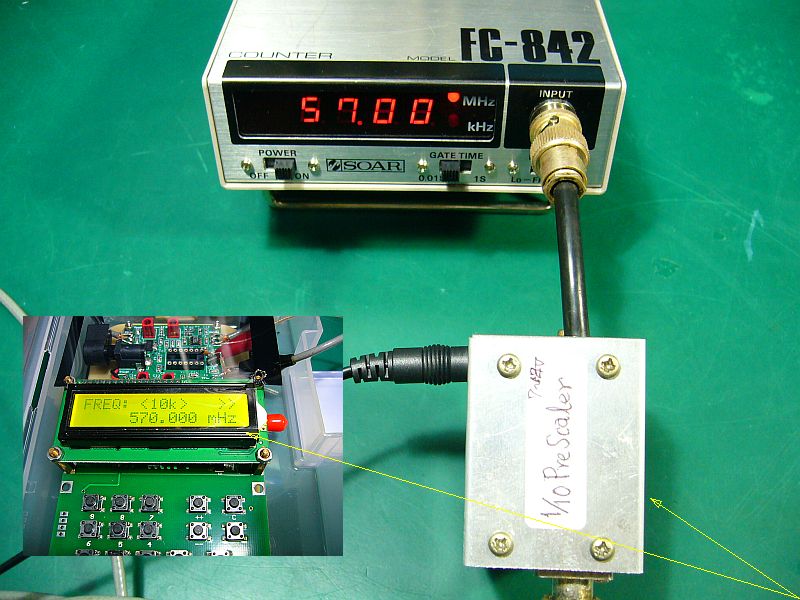以前に注文していたプリ・スケーラIC「MC12080」(2個¥1,500送料込み)が来たので、汎用カウンタ「FC-842」(max 50MHz)用として、「1/10プリ・スケーラ」を作成した。(図1)