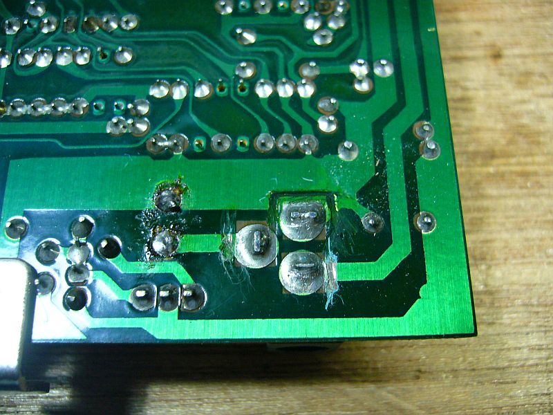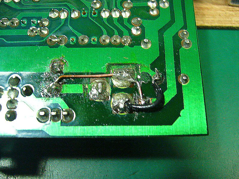 兎に角、これを(私が良く使う)"センタ側プラス"方式にする為に、パターンをカッター・ナイフで切り裂いた。(図5 左側の再ハンダ箇所は、バッテリへの配線を変更した際の痕跡)