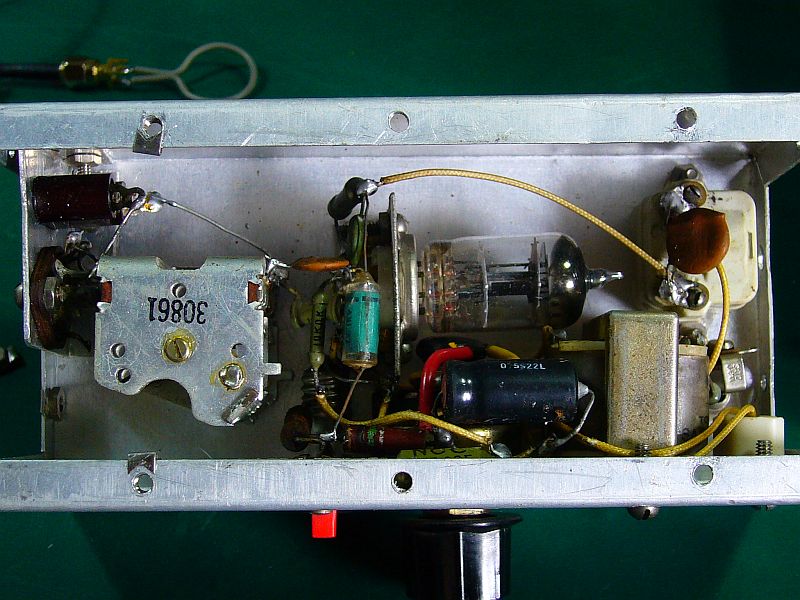 発振に使っているのは、高周波増幅用真空管9002」(「6AK5」に類似だったはず)で、ヒータだけは6.3V,0.3Aのトランスを使い、高圧側はAC100Vをそのまま整流して利用した"トランス・レス方式"だ。(図5