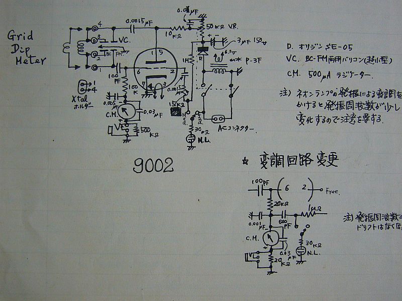 また、これを"RF信号発生器"として使う時には、変調信号として、ネオンランプの発振周波を使っている。 (が、何やら、改良してあるようだが、これは出来るだけ少ない小さい部品で、色々なことをやらせようという魂胆だった。私は、今でもその癖が抜けない)