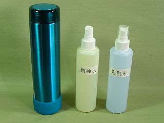 「酸性水」は、「美肌水」と一緒に使うので、百五円ショップで買った噴霧式のプラ・ボトルに入れてありますが、一回の使用量がそれ程多くないので、減らない!(左写真の中央、右端)