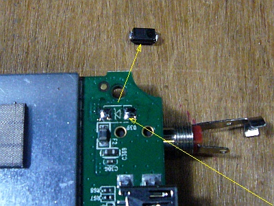 でも、気分的には修復したという意味で、ランドも残っていることだし、逆接続保護用として、手持ちの電力用ダイオード(200V、1A)を半田付けした。(図5)