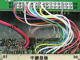 左下写真は、実際の結線の様子。右側の表は、結線表。下の横長表は、中継基板の端子配置。