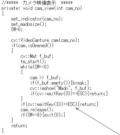 今回は、エラー発生を停めるのに、当初は5秒間の休憩ではどうだろう?と、returnの前辺りにwaitKey(5000)を入れることから始めた。