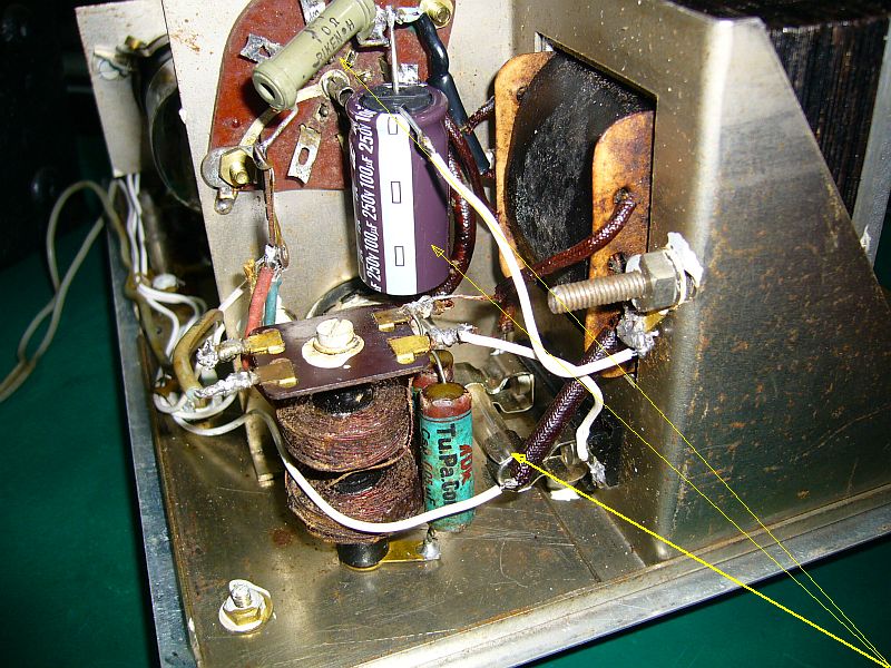 その修理は、電解コンデンサの片側をチューブラ型(100μF/250V)と入れ替え、また平滑用抵抗を10Ω、後で100Ωに付け替えた。(図3)