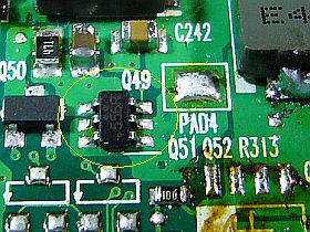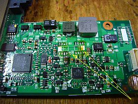 そこで、一大決心をして、可能性のある基板上のデバイスを一つずつ_高温度ブロワで加熱して半田付けを熔かしながら_剥がして、大電流が止まるかどうかを調べてみました。_左上写真<クリック>_