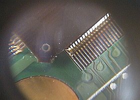 その内、ふとCPUに眼をやると、足ピン列に何やらムラが見えます。ルーペで確かめると、ピンがあちこちで曲がっているのが分かりました。半田付けが外れているピンもあります。どうやら、原因は、これらのようです。
