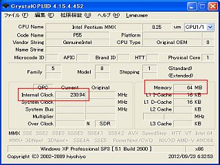 当初、割合スムーズにWinXpが組み込めそうな雰囲気だったので、もしかしたらメモリが128MBくらい入ってるかな?と甘い期待をしていたのですが、CrystalCPUIDで中身を探ると、やはりCPUクロックもメモリも額面通りでした。_左写真_