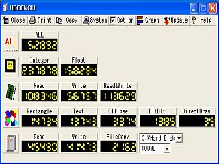 このマシンには、Intel Core Duoが載っているそうなので、さぞかし高性能なんだろうなと思い、HDBENCHを走らせてみました。_左図_