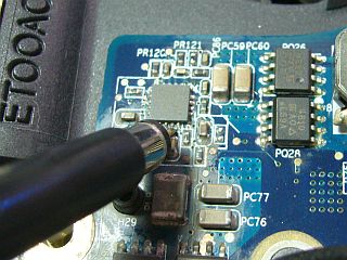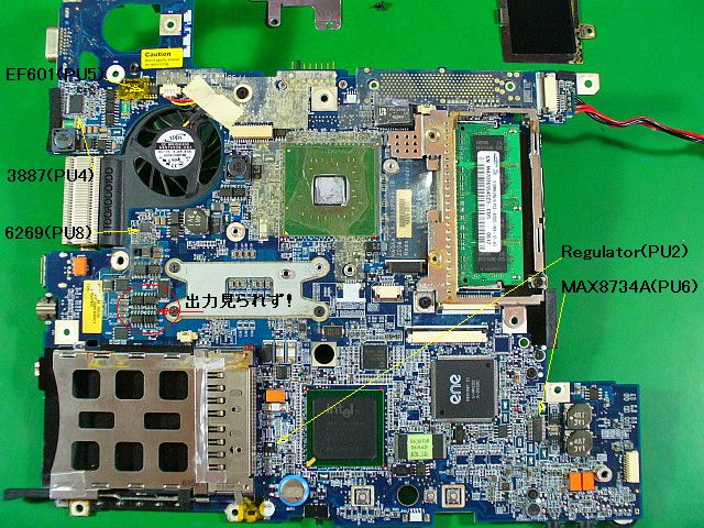 CPUの傍のMOSFETスイッチから、本来は何か出力が出ているはずなのですが、何も見られな〜い!_左写真赤印_