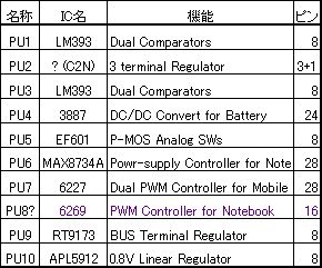 シルクで「PU」と印刷されているICが、電源関係だろう思います。