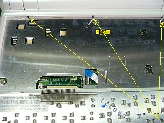 で、キーボードを先に外しましたが、これがまた ・・・ 3箇所のちっちゃい爪を上に押し込んで、キーボードが浮き上がるのを待って_いや、細ドライバの先で引き上げないと上がってこない!_外さないと!これ、ちゃち過ぎない?_左写真_