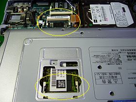 筐体裏面にはメモリ出し入れ蓋が無いので、きっとパームレスト下かキ-ボード下でしょう。出し入れには、手間が掛かりそう。_左上写真<クリック>_