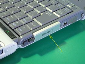 動作が鈍くて、実用にはし難いけど、一応、形だけは整えてみようと、以前使っていたSONY製短頭型無線LANカード PCWA-C150を入れてみました。_左写真_