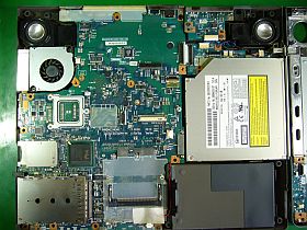 筐体分解後、ファンは直ぐに外せましたが、CPUは主基板の裏側にあるので、結局、基板を抜き出しての作業になりました。_やれやれ... 左写真<クリック>_