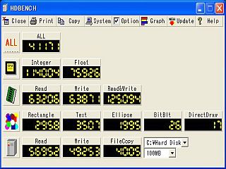 HDBENCH_WinXp上で_の結果を見ると、ALL値では、41Kと十分な値だが、やはりVIDEO値が低い|良くない。_左図 WinVista上だと、更にALL値も31Kへと下がる_