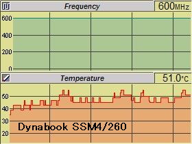 このマシンは、冷却ファンが無く、“シンプルな放熱タブ”_左写真<クリック>_と「CPUクロック制御」だけで温度調節をしているようですが、「急激な変動」は、約10℃以内で納まっているようです。