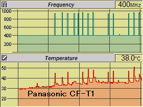 Panasonic CF-T1では下左図のように、忙しい時には_SpeedStep効果で_CPUクロックが倍以上に跳ね上がるので、それに合わせてCPU温度も引き摺られて上がっています。_これは、ちょっと気になる状態ですが、これでもいいのかな?_